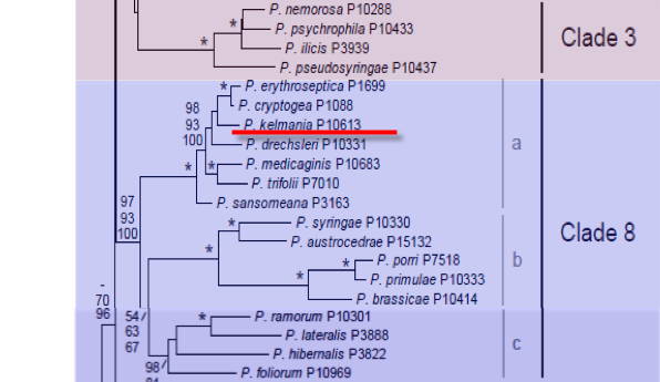 Phytophthora sp. Kelmania is a non-papillate provisional species (Abad et al. in clade 8a basal to P. cryptogea. It has been reported on Abies spp. Picea spp., Gerbera sp. and Coleus sp.