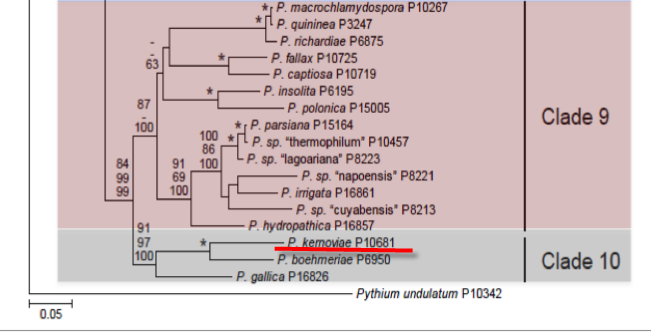 Phytophthora kernoviae Brasier, Beales & S. A. Kirk was previously known as the provisional species Phytophthora taxon C (PtC). It has been recovered from Southwest England and New Zealand and in phylogenetic analysis is placed in clade 10 with P. boehmeriae as the closest relative.