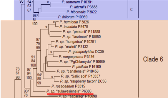 Genus wide phylogeny for Phytophthora using four mitochondrial loci (cox2, nad9, rps10 and secY; 2,373 nucleotides). Maximum likelihood branch lengths shown. Numbers on nodes represent bootstrap support values for maximum likelihood (top), maximum parsimony (middle) and Bayesian posterior probabilities as percentages (bottom). Nodes receiving significant support (>95%) in all analysis are marked with an asterisk (*). Scale bar indicates number of substitutions per site.(Martin, Blair and Coffey, unpublished).