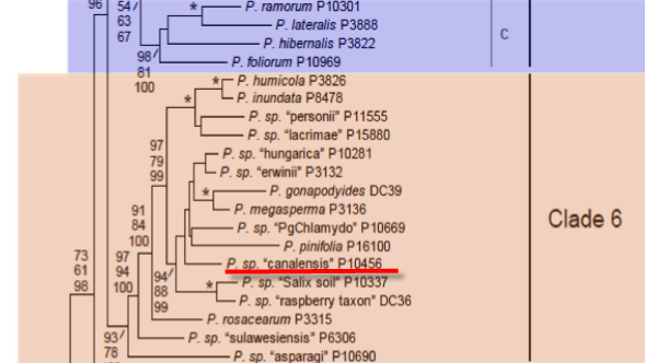 Genus wide phylogeny for Phytophthora using four mitochondrial loci (cox2, nad9, rps10 and secY; 2,373 nucleotides). Maximum likelihood branch lengths shown. Numbers on nodes represent bootstrap support values for maximum likelihood (top), maximum parsimony (middle) and Bayesian posterior probabilities as percentages (bottom). Nodes receiving significant support (>95%) in all analysis are marked with an asterisk (*). Scale bar indicates number of substitutions per site.(Martin, Blair and Coffey, unpublished).