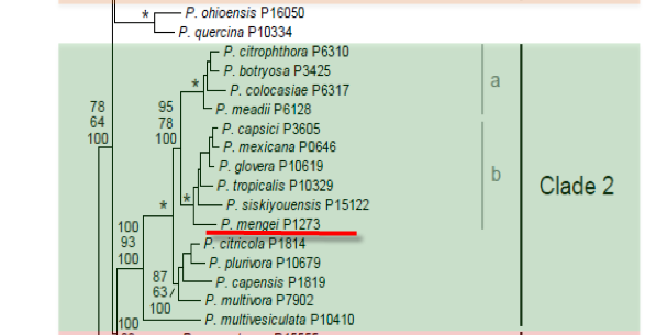 Phytophthora mengei G.T. Browne, M.E. Gallegly & C.X. Hong historically has been considered part of the P. citricola species complex. Hong et al. (2009) confirmed this taxon as a distinct species that is phylogenetically in clade 2c basal to P. siskiyouensis.