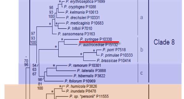 Notes: Klebahn described this species in 1906 as a new species; according to Tucker (1931) it was previously described by Berkeley in 1881 as Ovularia syringae (misapplied to an anamorphic ascomycete genus). As a result the author citation should be (Berk.) Kleb. not (Kleb.) Kleb. as is frequently seen in the literature. Phytophthora hibernalis was considered by Tucker (1931) to be synonymous with Phytophthora syringae but they are now considered distinct species (Ho & Jong 1993). The name Phytophthora syringae has been applied to a root and collar rot of deciduous trees in Europe, which has now been described as a distinct species Phytophthora pseudosyringae (Jung et al. 2003).