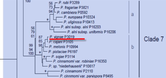 Phytophthora vignae Purss 1957 (Oomycetes, Pythiales)Phytophthora vignae f. sp. adzukicola S. Tsuchiya, Yanagawa & Ogoshi 1986 Note: Form species have no standing in the ICBN. This one applies to isolates that infect Vigna angularis. Phytophthora vignae f. sp. vignae S. Tsuchiya, Yanagawa & Ogoshi 1986 Note: Form species have no standing in the ICBN. This one applies to isolates that infect Vigna unguiculata. Notes: Tsuchiya et al. (1986) used the name Phaseolus radiatus var. aurea for adzuki bean. This bean is usually associated with the name Vigna angularis. Some consider Phaseolus radiatus var. aurea to be a synonym. Presumably, true adzuki bean was studied. Although the two form species of Phytophthora vignae may be distinct taxa, no one has formally recognized them as such. Distribution: Asia, Australia. Substrate: Stems, soil; also leaves, roots. Disease Note: Stem rot, leaf spot, may completely destroy root system. Host: Natural hosts: Vigna unguiculata (= Vigna sinensis, Fabaceae), Vigna angularis (=Phaseolus angularis, Fabaceae, sometimes referred to Phytophthora vignae f.sp. adzukicola). Malus domestica (apple, Rosaceae) fruits can be infected when inoculated. Reports from a few other taxa. Supporting Literature: Erwin, D.C., and Ribeiro, O.K. 1996. Phytophthora Diseases Worldwide. APS Press, St. Paul, Minnesota, 562 pages. Kroon, L.P.N.M., Bakker, F.T., van den Bosch, G.B.M., Bonants, P.J.M., and Flier, W.G. 2004. Phylogenetic analysis of Phytophthora species based on mitochondrial and nuclear DNS sequences. Fungal Genet. Biol. 41: 766-782. Tsuchiya, S., Yanagawa, M., and Ogoshi, A. 1986. Formae speciales differentiation of Phytophthora vignae isolates from cowpea and adzuki bean. Ann. Phytopathol. Soc. Japan 52: 577-584. Updated on Nov 21, 2008