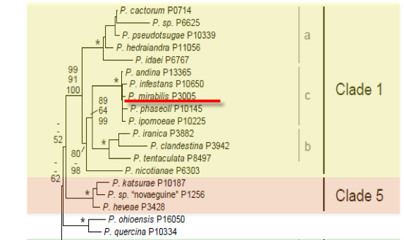 Goodwin, S.B., Legard, D.E., Smart, C.D., Levy, M., and Fry, W.E. 1999. Gene flow analysis of molecular markers confirms that Phytophthora mirabilis and P. infestans are separate species. Mycologia 91: 796-810